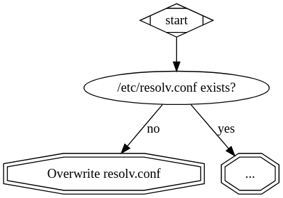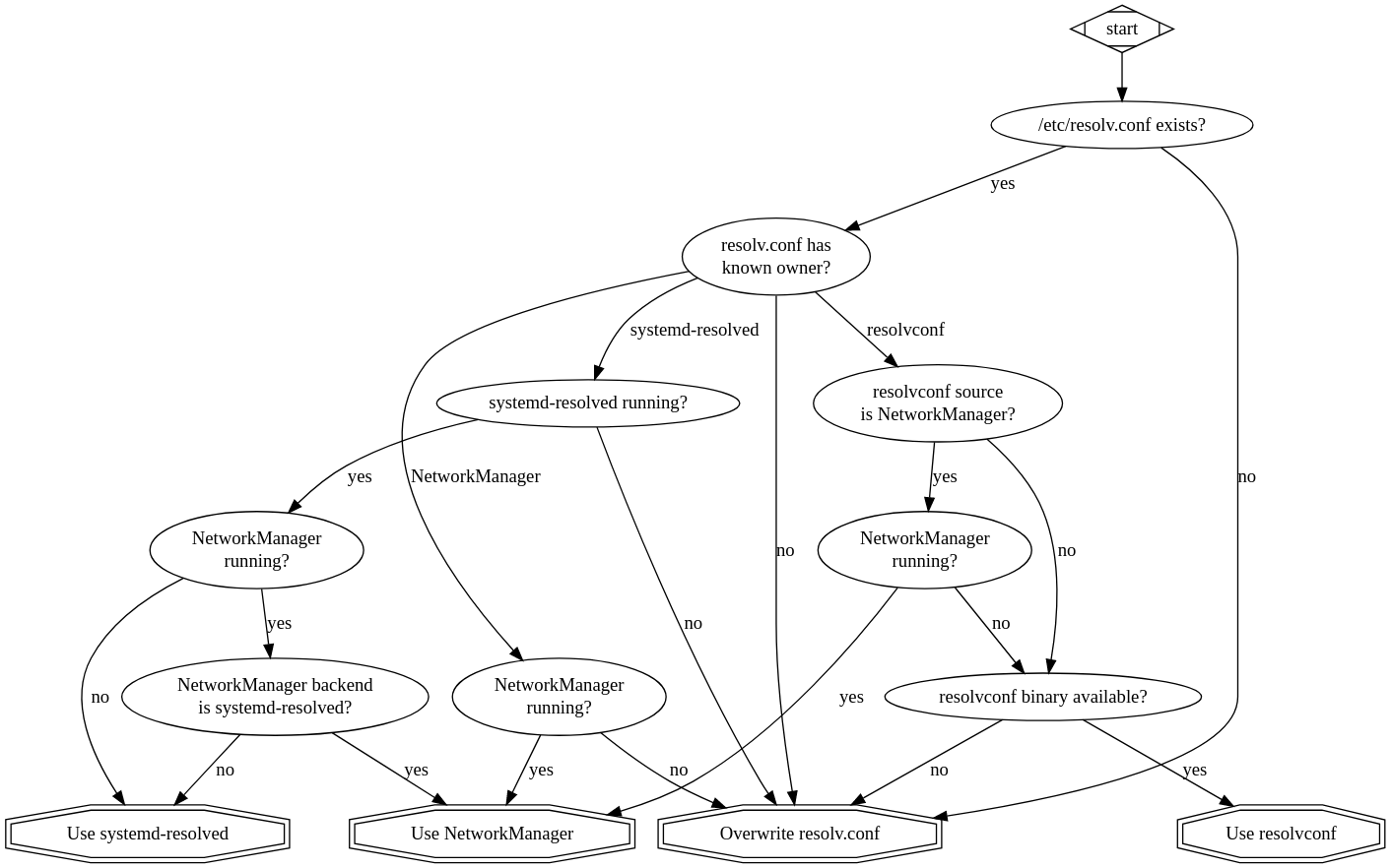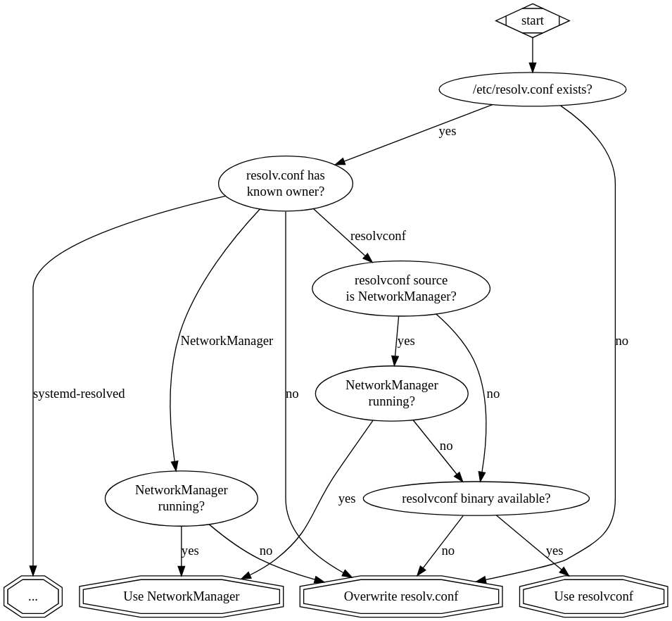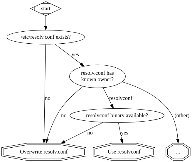 NetworkManager还给resolvconf的路径添加了一个问题: 如果resolvconf生成的配置来自NetworkManager,应当尝试使用NetworkManager而不是resolvconf。因此,需做一个额外的检测,看看是否resolvconf是由NetworkManager提供的,如果是则切换到NetworkManager。